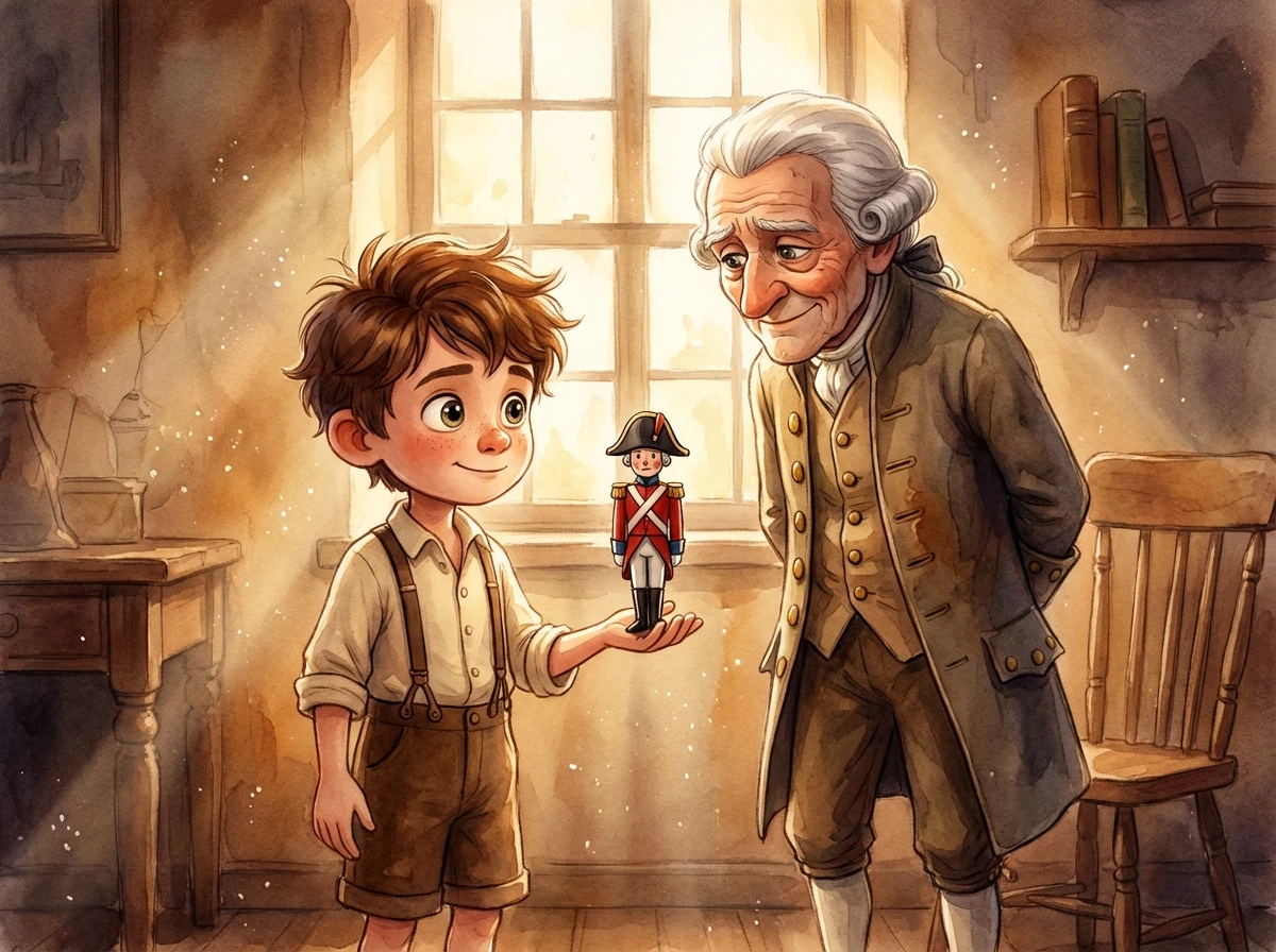 Der kleine Junge hörte seine Eltern sagen: "Der alte Mann gegenüber ist sehr wohlhabend, aber schrecklich einsam." Am nächsten Sonntagmorgen wickelte der kleine Junge etwas in Papier und brachte es zur Tür des alten Hauses. "Würden Sie das bitte von mir dem Herrn geben, der hier wohnt," sagte er. "Ich habe zwei Zinnsoldaten, und das ist einer von ihnen, und er soll ihn haben, weil ich weiß, dass er schrecklich einsam ist."