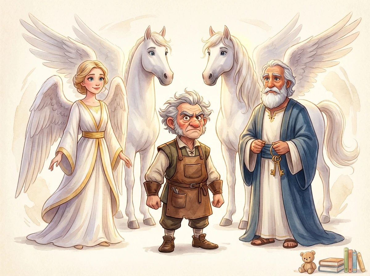 Master Pfriem woke in his own bed, heart beating fast. "Things are arranged differently in heaven than on earth," he said softly. He hurried to his workshop, still lively as ever. But somewhere deep inside, the dream stayed quietly with him, waiting for the day he might finally learn to look and listen before he judged.